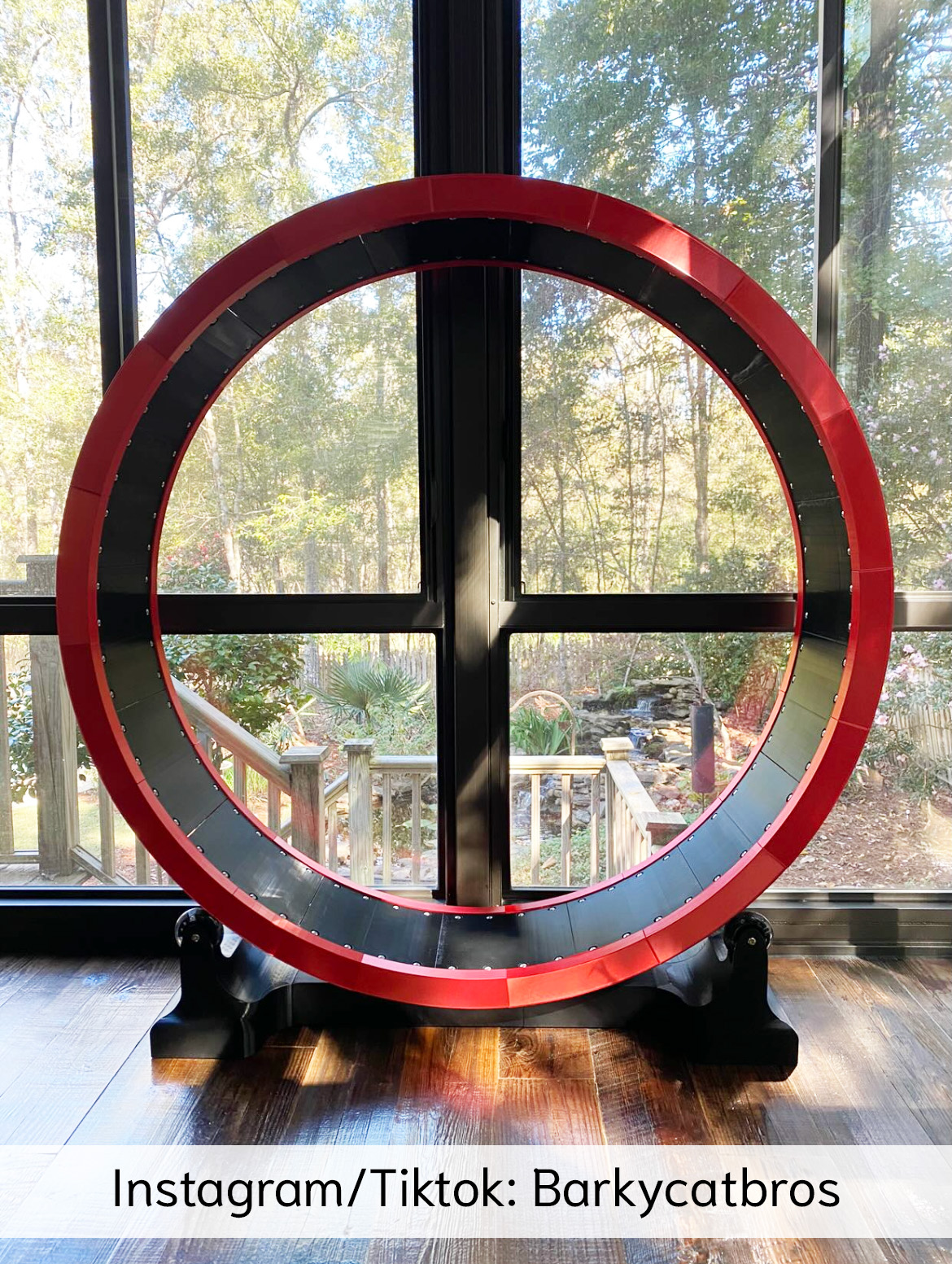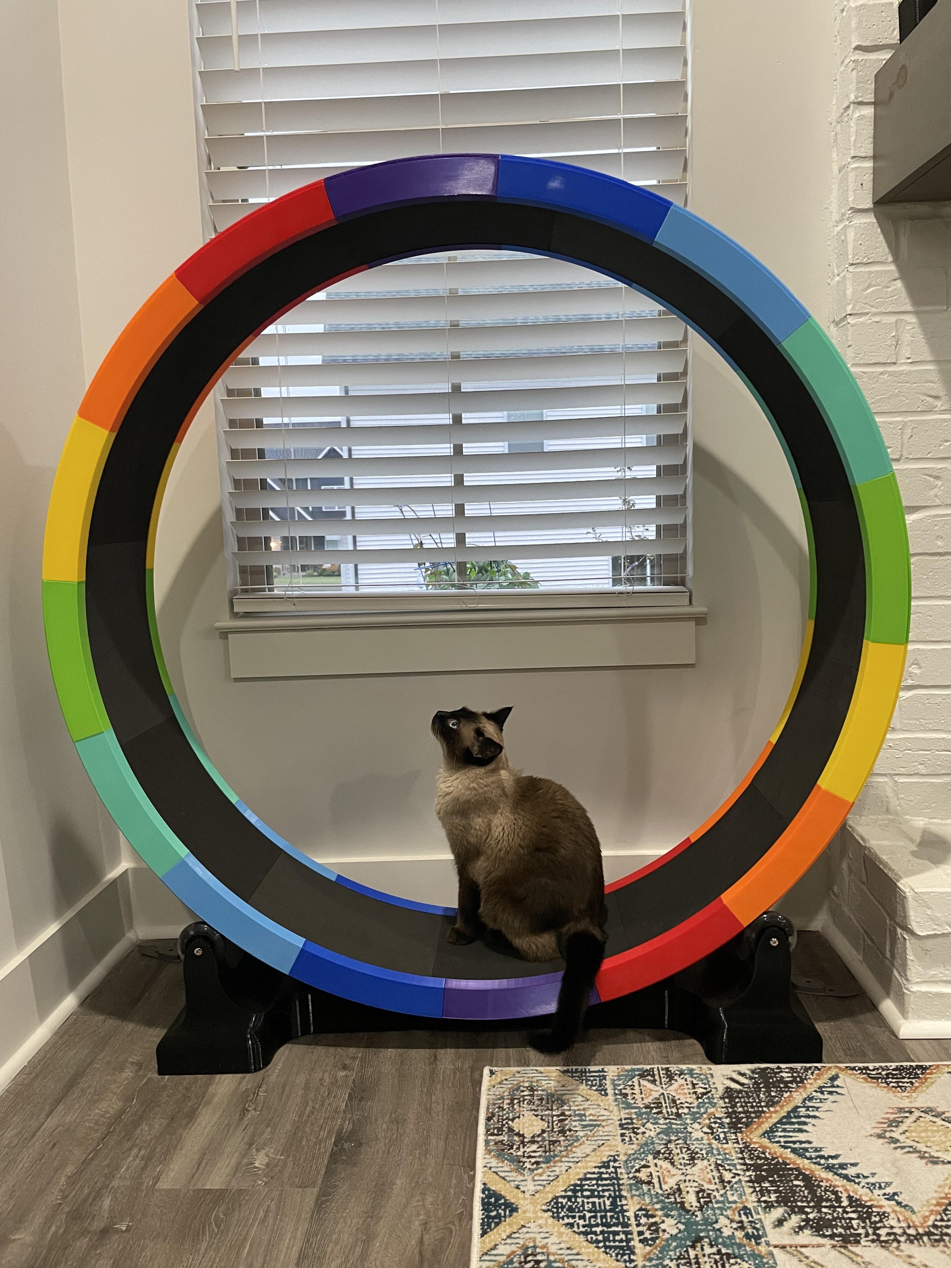 This started as a personal challenge as I, a.) Made an impulse decision to buy a 3D printer, b.) Wanted to learn Fusion 360 to make something useful, and c.) Wanted to replace my existing cat wheel. I had already purchased a cat wheel but it spun poorly, didn't have a stable base, and I hated the fact that they used fiberglass in the rails without warning people and it messed up my hands. I won't name the company, but they are the first one to show up if you Google "cat wheel". People asked to buy the STLs when I posted a video on Facebook, so I've uploaded the files on Cults3D. If you purchase my files, you agree to not sell or share them, including the printed wheel itself.