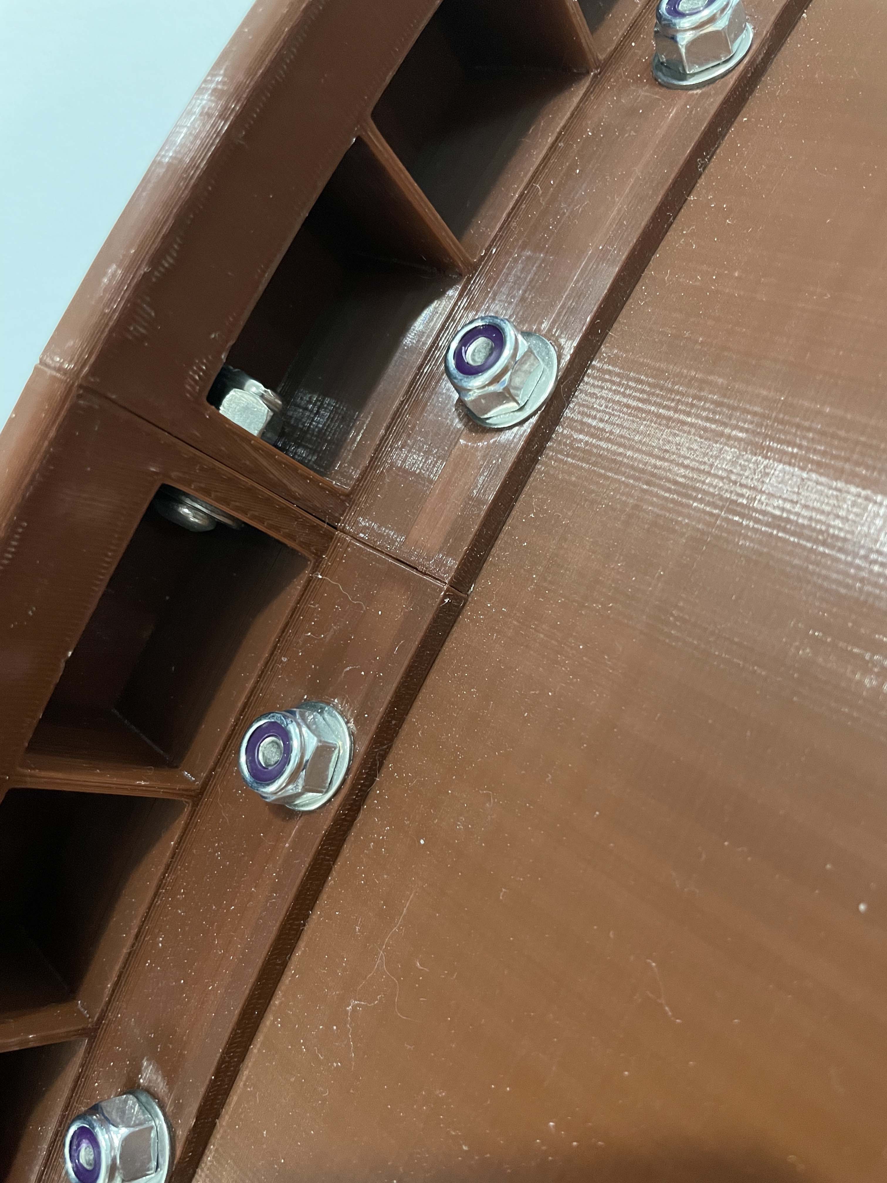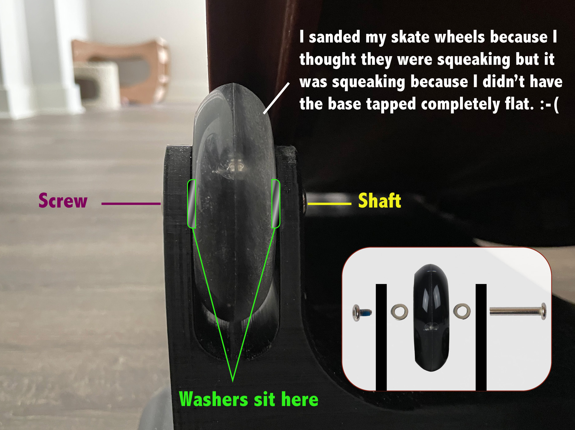 Please scroll down and read over the hardware needed. This isn't a cheap project, but you'll end up with the satisfaction of making something awesome for your amazing cat(s) and having a sturdy cat wheel. Oh, and you can make it any color you want! I can't tell you the exact cost of this. The parts outside of the filament cost me around $100 but you can certainly shop around. How much filament you will need will be determined by the settings you use. I used a lot of infill to make mine heavy; I picked a weight I wanted and adjusted the slicer until I achieved that weight. I found photos from July 2021 of the rails (with supports) and tracks sitting on a scale and they were each 162 and 163 grams, respectively. I've re-sliced the base pieces to get a weight and it came out to 4,880g, but you can make it lighter than that. Somebody who printed the wheel used a lot less infill than I did. I used 15% infill on the base corners and 10% on the three pieces that connect the corners. I used 4 walls and 6 top and bottom layers. My wheel took around 13 spools when you add it up. GST3D PLA+ was selling at $8 a spool at the time.
