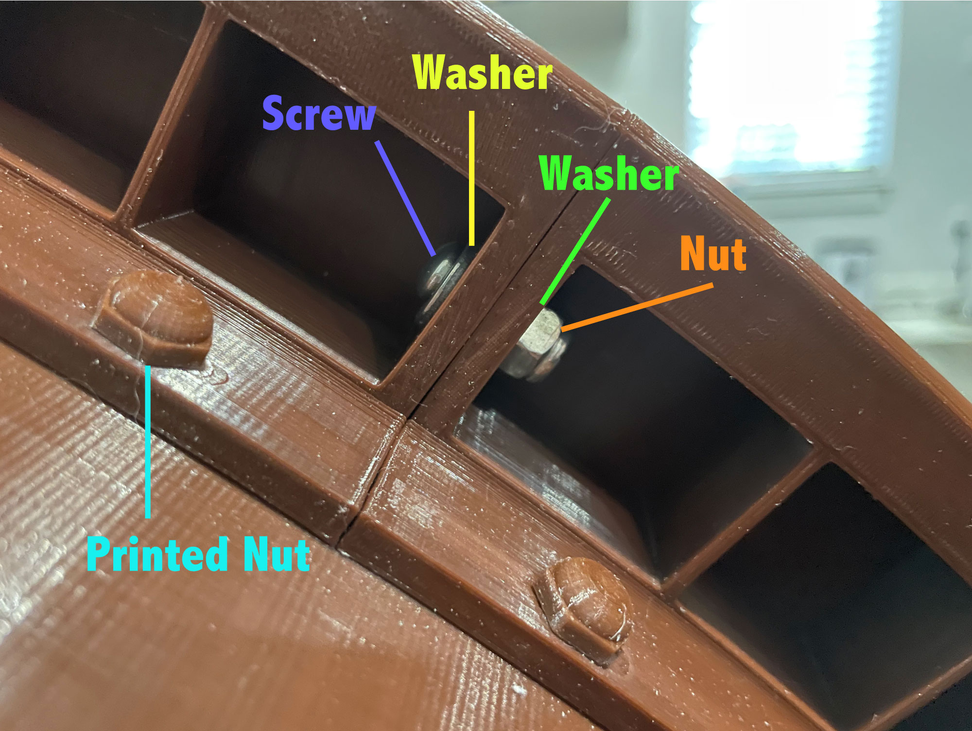 Once the wheel was put together, I put a dot of super glue under the printed nuts on the walkway, just in case. You don't need to do that if you use metal ones.